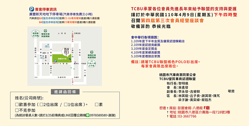 [TCBU第四屆第三次會員經營座談會] 日期:110年4月9日 時間:下午三點半開始報到四點開會 地點:八德彭園餐廳(廣豐新天地) 地址:八德區介壽路一段728號3樓