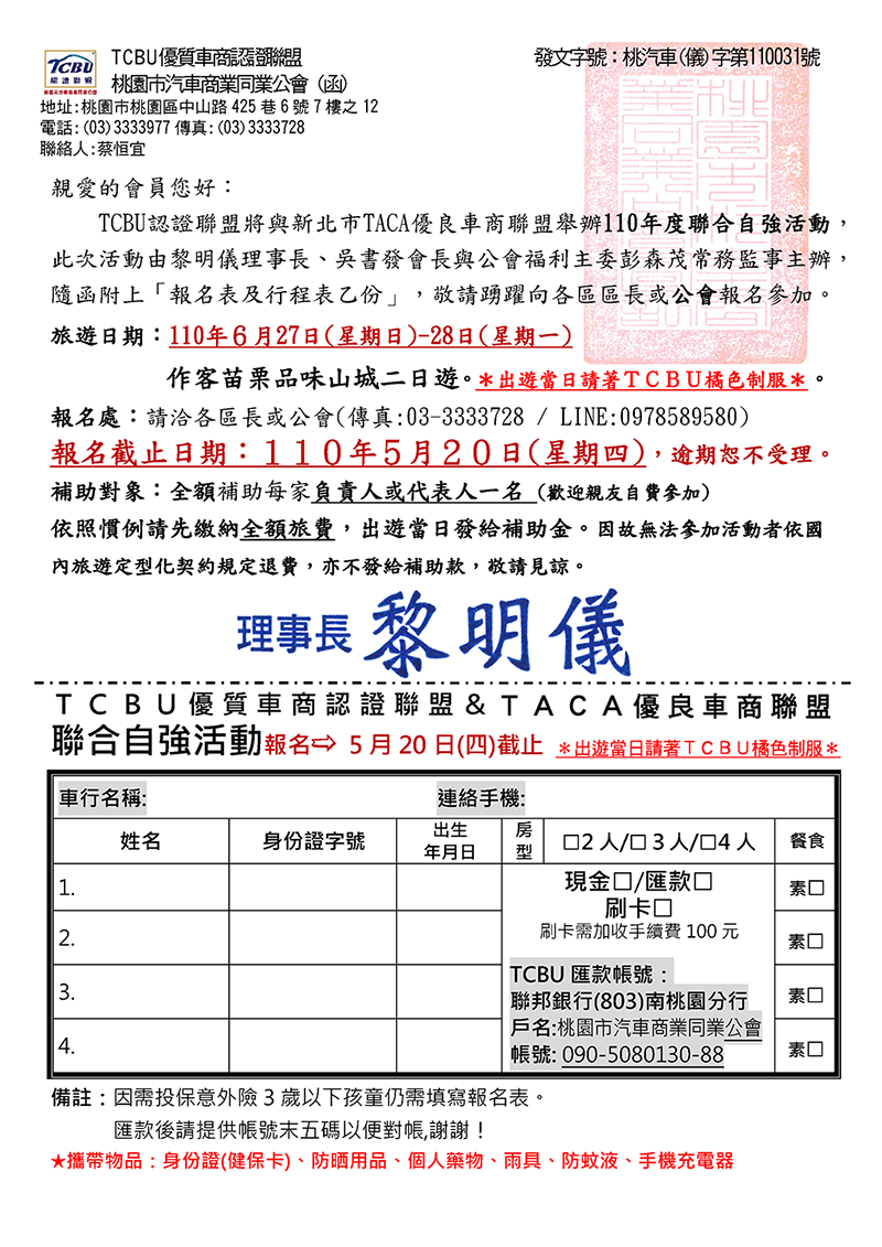TCBU優質車商認證聯盟將與新北市TACA優良車商聯盟舉辦110年度聯合自強活動,此次活動由黎明儀理事長、吳書發會長與公會福利主委彭森茂常務監事主辦,隨函附上「報名表及行程表乙份」,敬請踴躍向各區區長或公會報名參加。