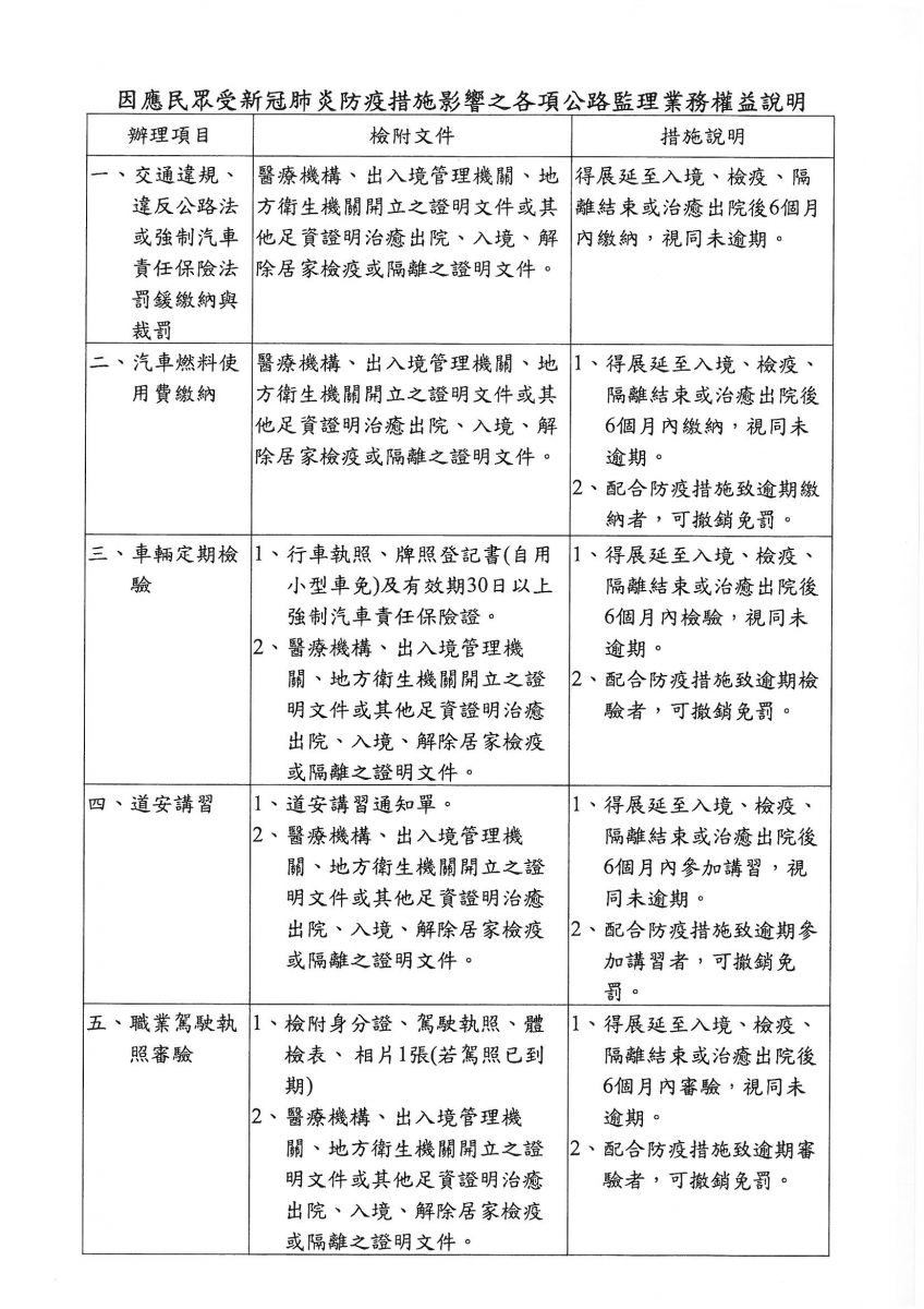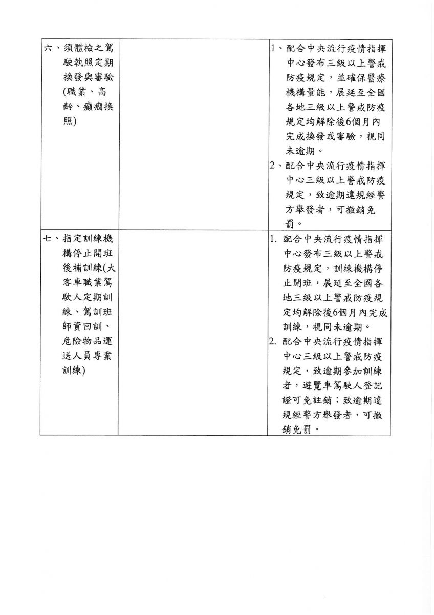 因應「全國」疫情警戒標準提升至第3級,交通部各項公路監理業務措施說明如附表所示。