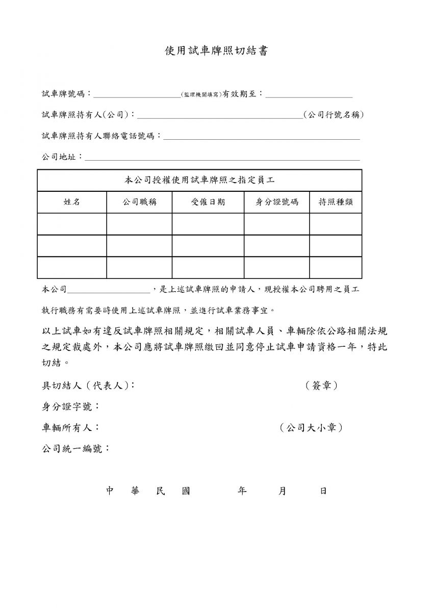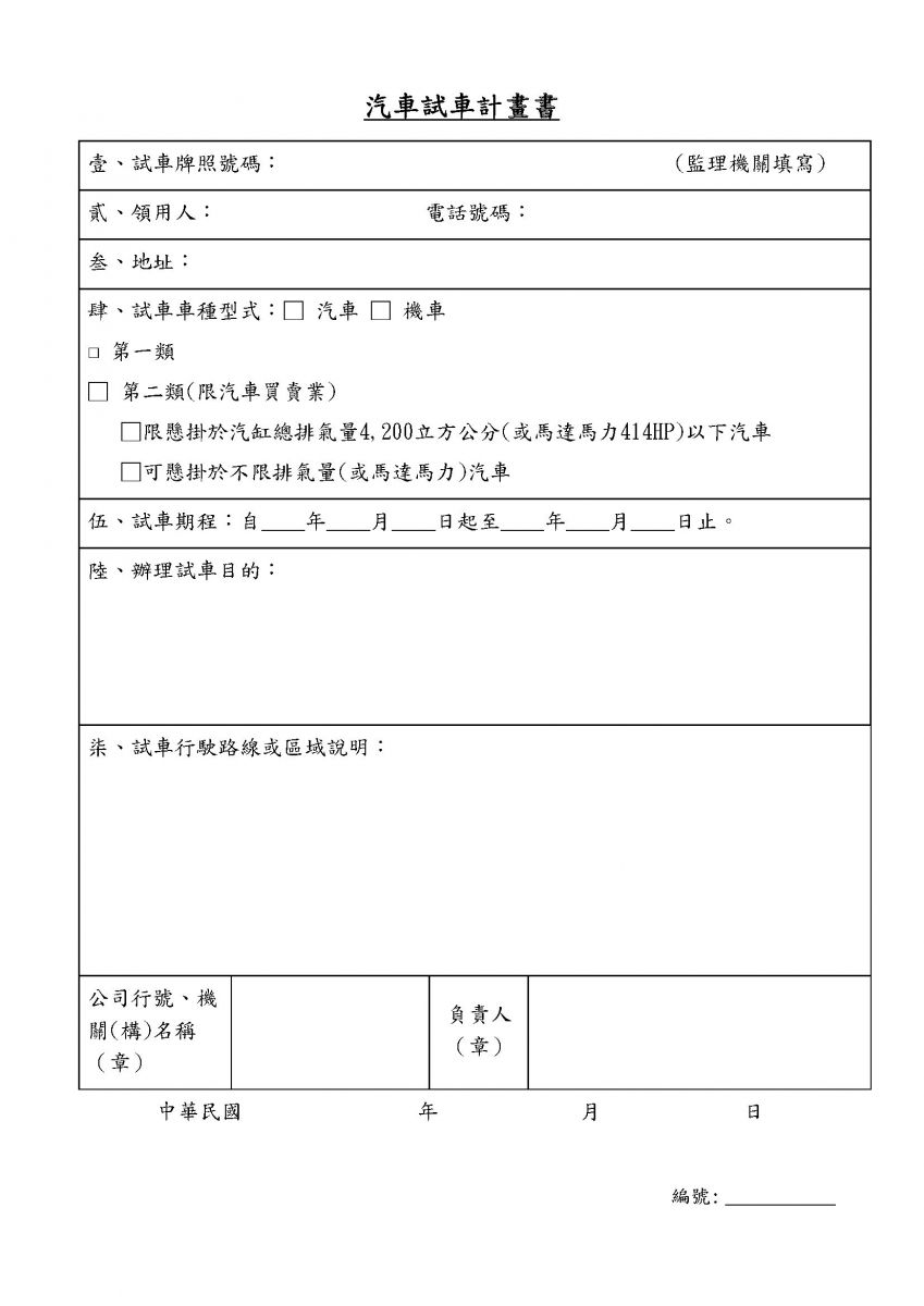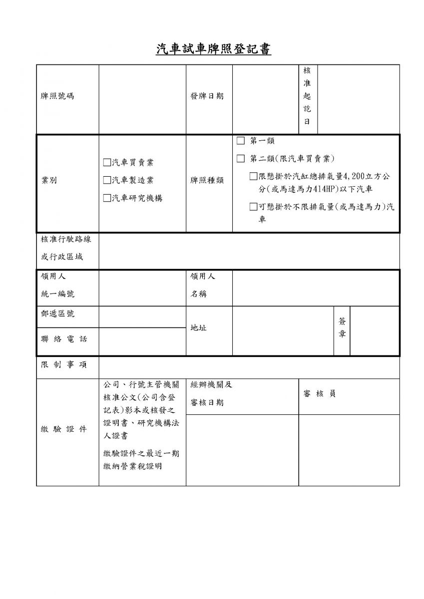 若會員車商需要申請可以上國道的第二類試車牌,請下載以下申請資料填寫並備齊資料與規費送至公會,由公會統一送件至監理站申請!!