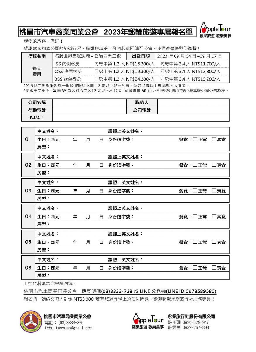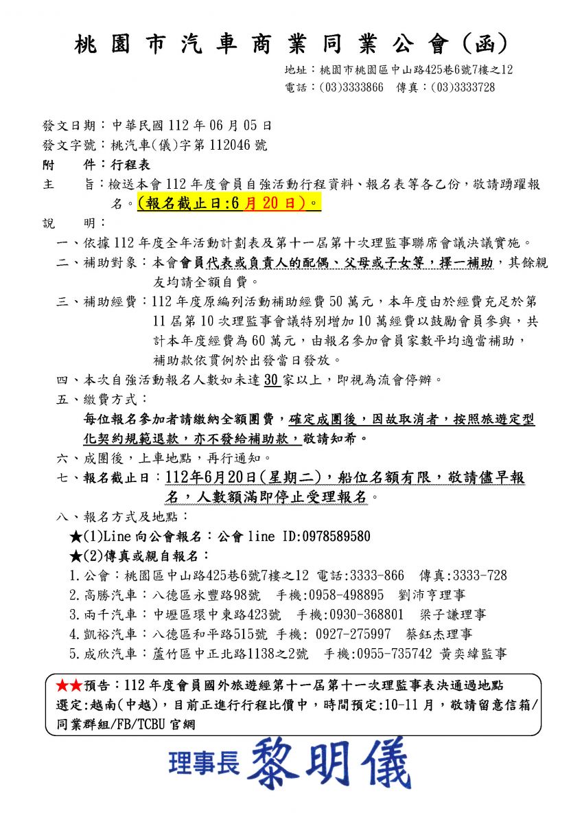 桃園市汽車商業同業公會 112年度會員自強活動已發文,敬請會員留意信件與報名截止日,行程詳見發文內容。 補助對象:本會會員代表或負責人的配偶、父母或子女等,擇一補助,其餘親友均請全額自費