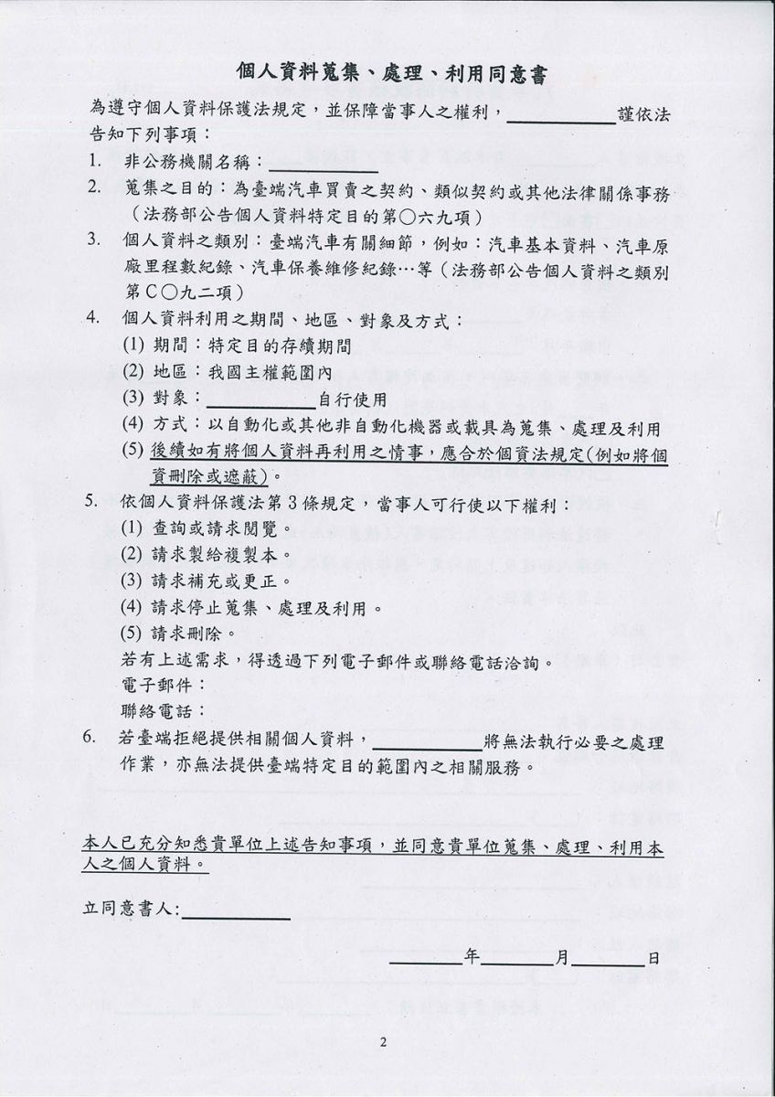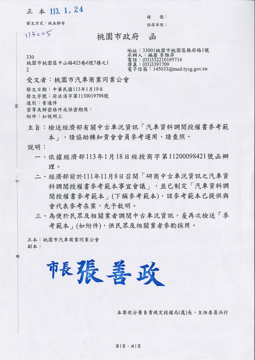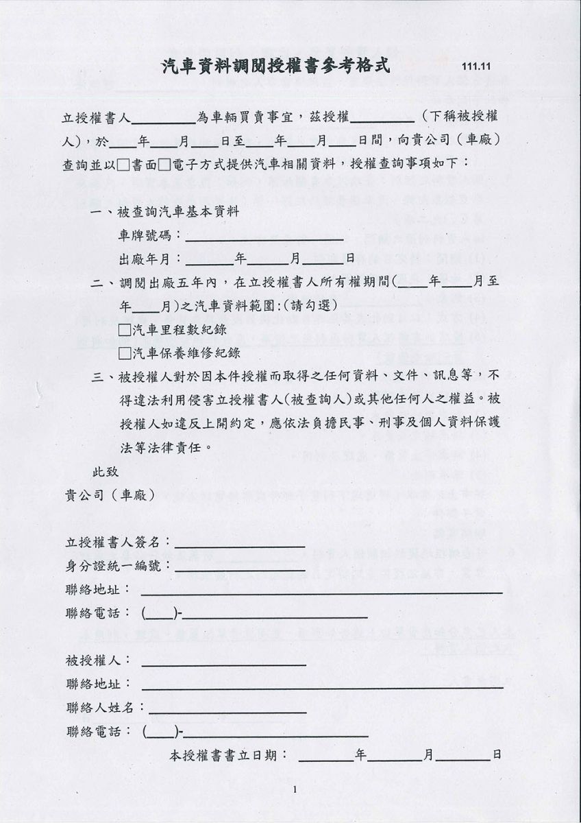 檢送經濟部有關中古車況資訊[汽車資料調閱授權書參考範本],請會員知悉。