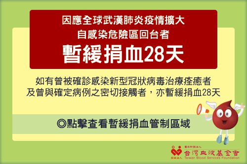 台灣血液基金會公告>>鑑於全球武漢肺炎疫情擴大,自下列地區回台者,暫緩捐血28天地區公告