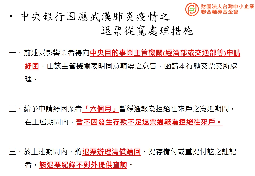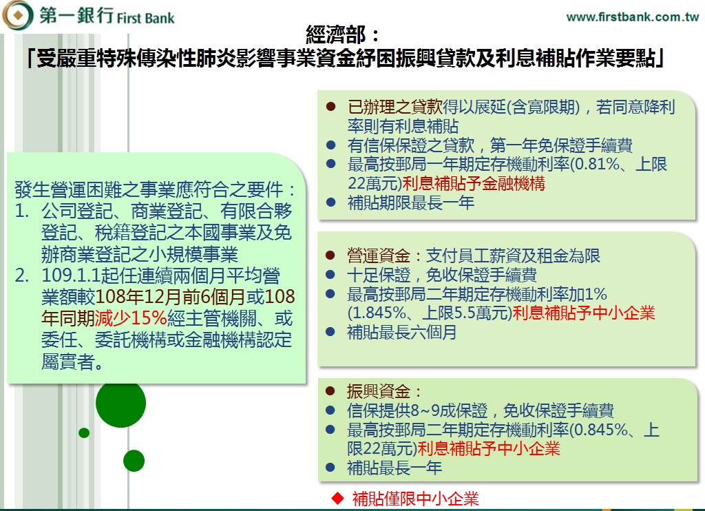 目前政府針對受武漢肺炎影響的中小企業提供多種資金協助,各位也可趁此機會對自家公司進行體質調整升級,我整理一些重要內容提供給各位,如有想進一步瞭解可洽詢以下聯絡窗口: