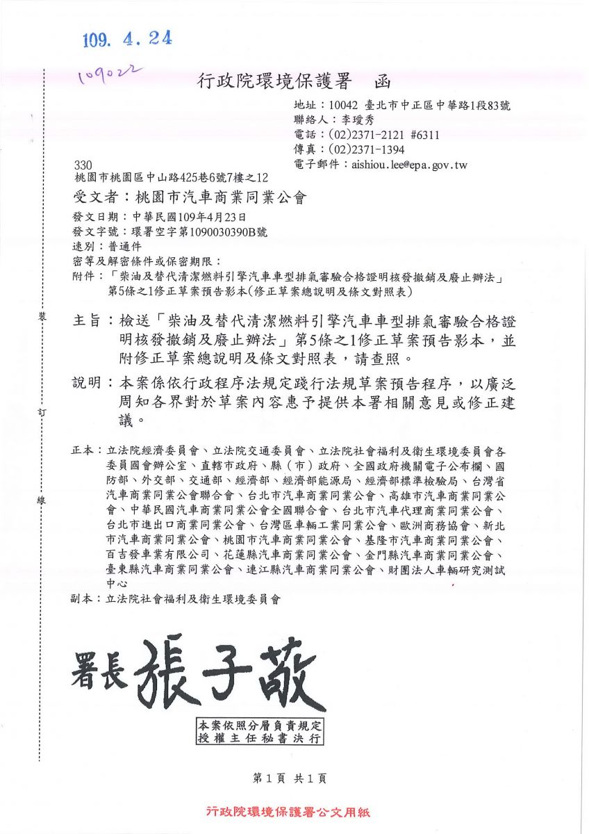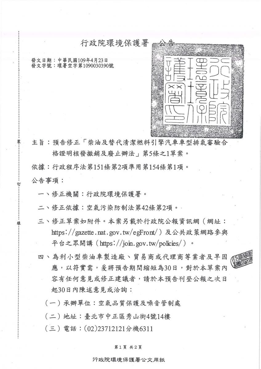 【柴油及替代清潔燃料引擎汽車車型排氣審驗合格證明核發撤銷及廢止辦法】第5條之1修正草案預告,請詳見內文。