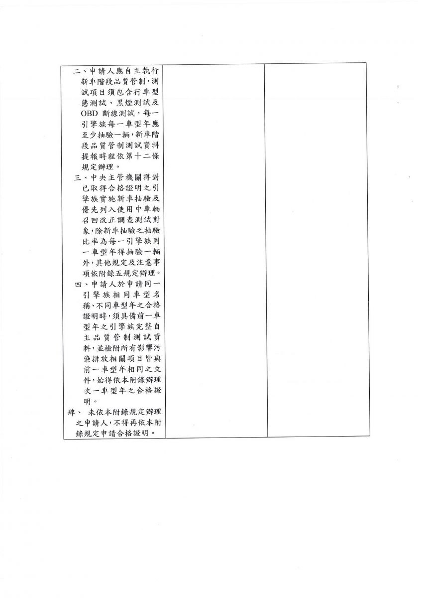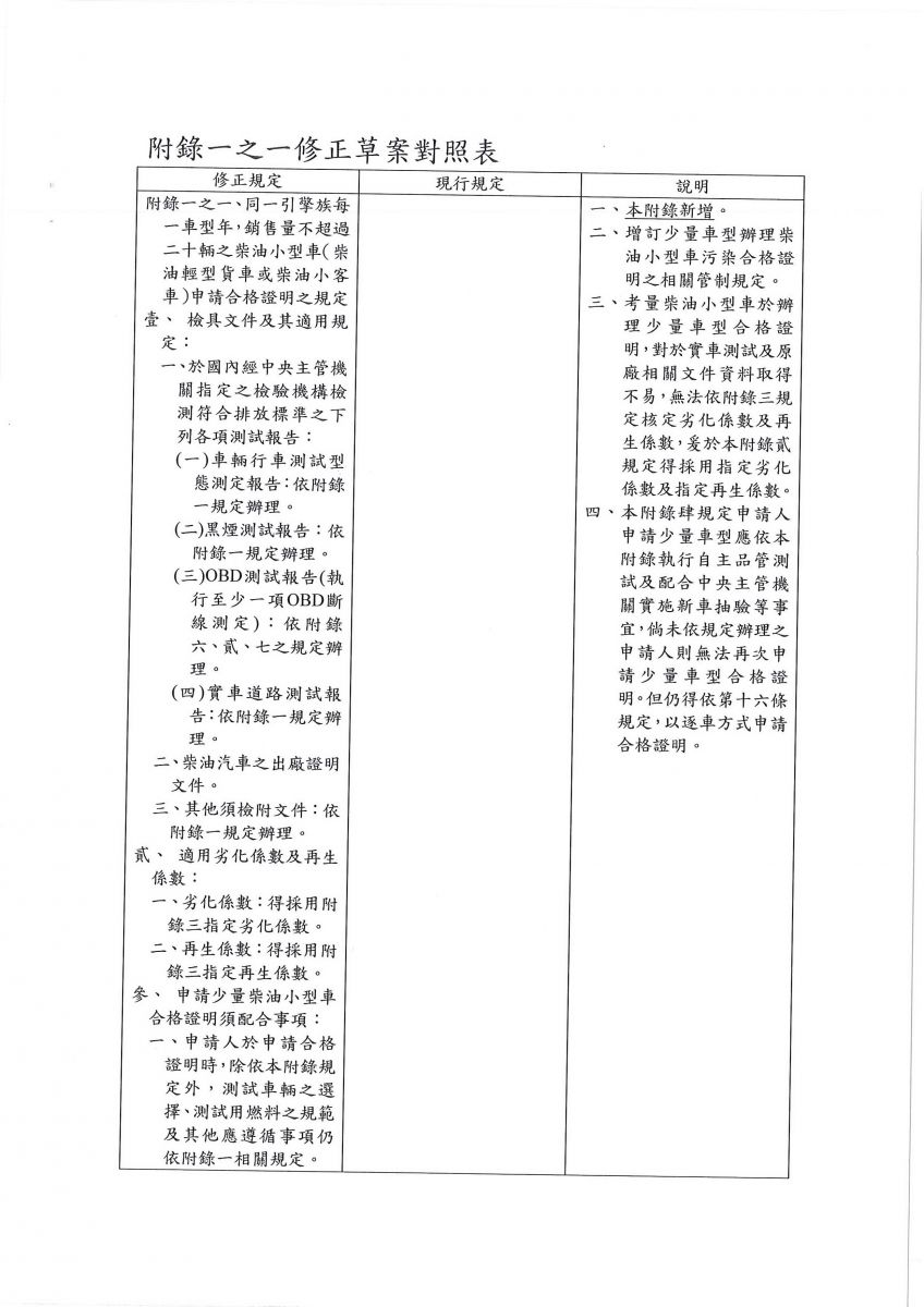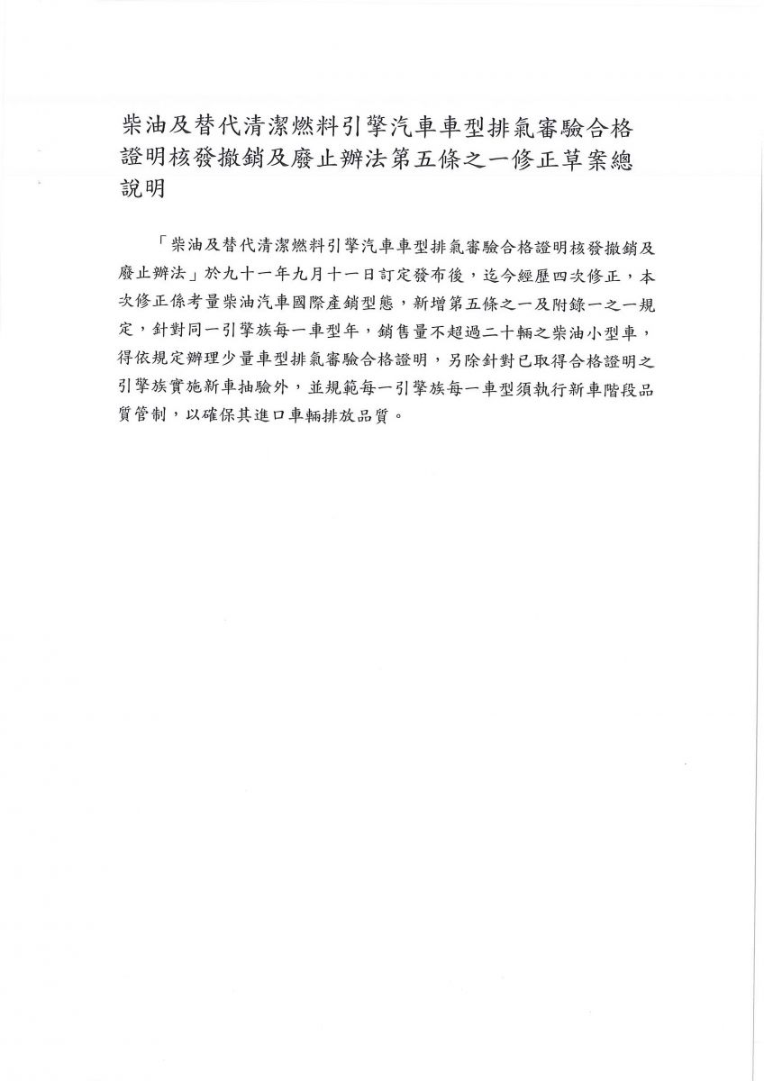 柴油及替代清潔燃料引擎汽車車型排氣審驗合格證明核發撤銷及廢止辦法於九十一年九月十一日訂定發布後,迄今經歷四次修正,本此修正係考量柴油汽車國際產銷型態,新增第五條之一及附錄一之一規定,針對同一引擎族每一車型年,銷售量不超過二十輛之柴油小型車,得依規定辦理少量車型排氣審驗合格證明,另除針對已取得合格證明之引擎族實施新車抽驗外,並規範每一引擎族每一車型需執行新車階段品質管制,以確保其進口車輛排放品質。