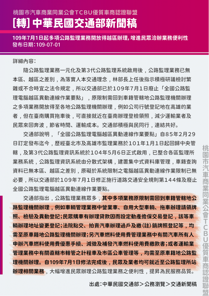 近日群組流傳動保註銷可跨區辦理,經陳坤瑩常務理事向公會反應後, 本會立即向桃園監理站確認,經動保承辦人員確認自7月1日起動保註銷確實可跨區辦理,並檢附交通部該則新聞稿 出處:中華民國交通部新聞稿網站