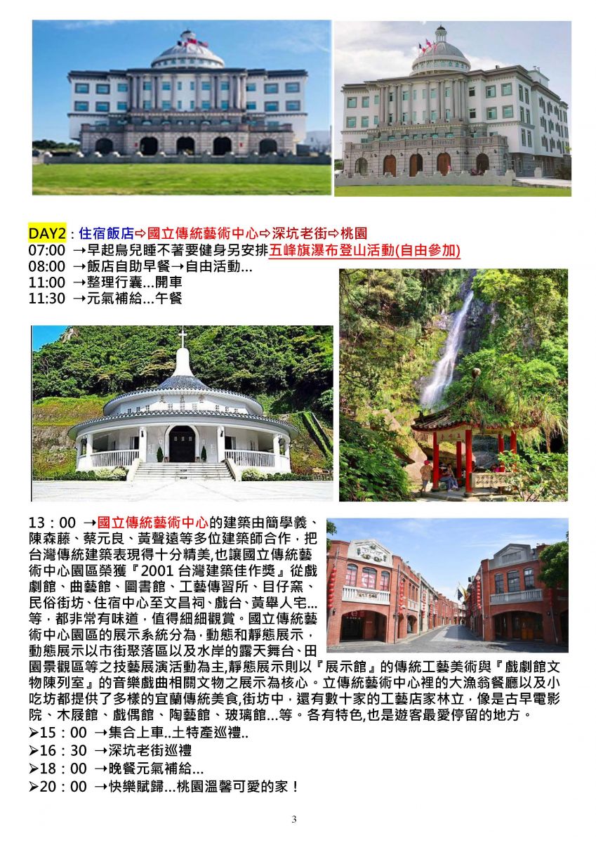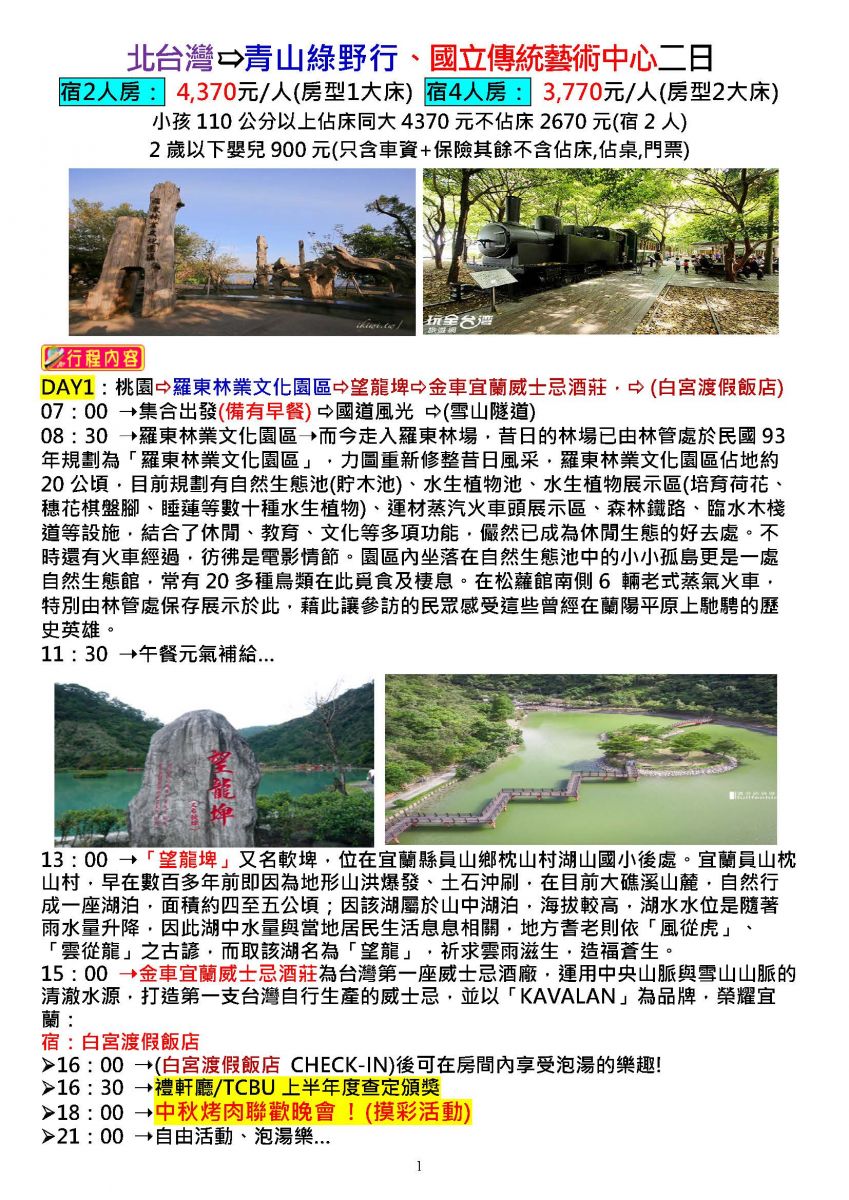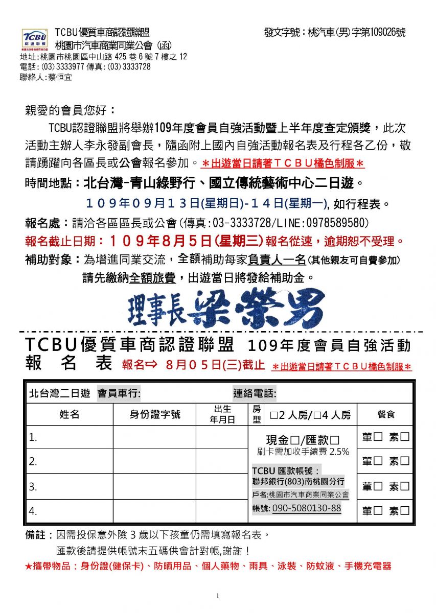 此次活動主辦人李永發副會長 北台灣二日遊<青山綠野行、國立傳統藝術中心>詳情請見附圖行程表,上半年度查定頒獎中秋烤肉聯歡摸彩活動,這樣的好康還不趕快+1,期待會員老闆們的參與 ※出遊當日請著TCBU橘色制服