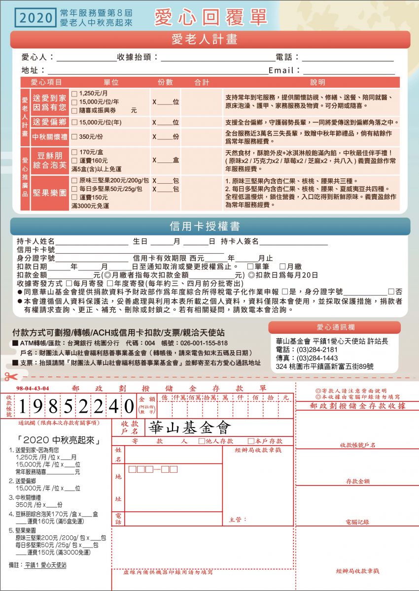 戶名:華山基金會(備註:109 中秋平鎮 1 站)
