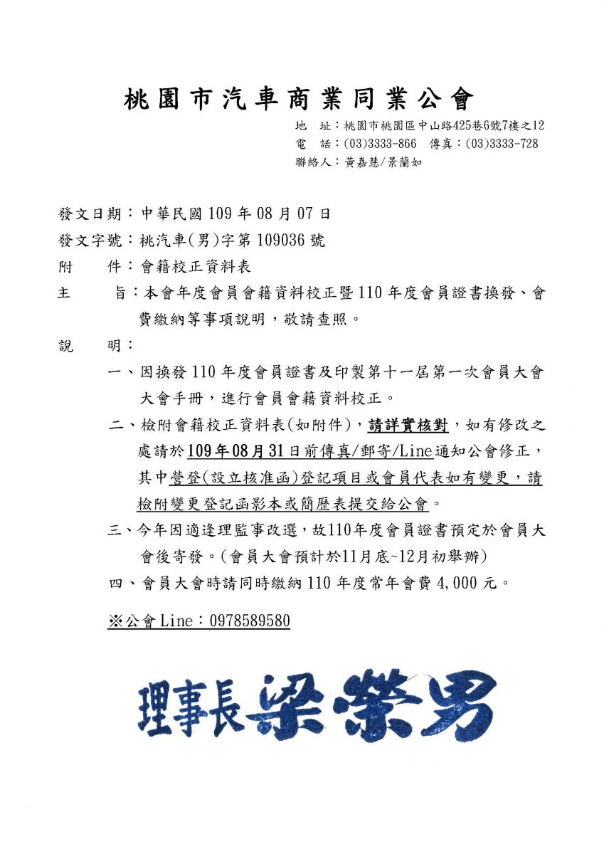 請於109年08月31日前傳真/郵寄/Line通知公會修正,其中營登(設立核准函)登記項目或會員代表如有變更,請檢附變更登記函影本或簡歷表提交給公會。※公會Line:0978589580