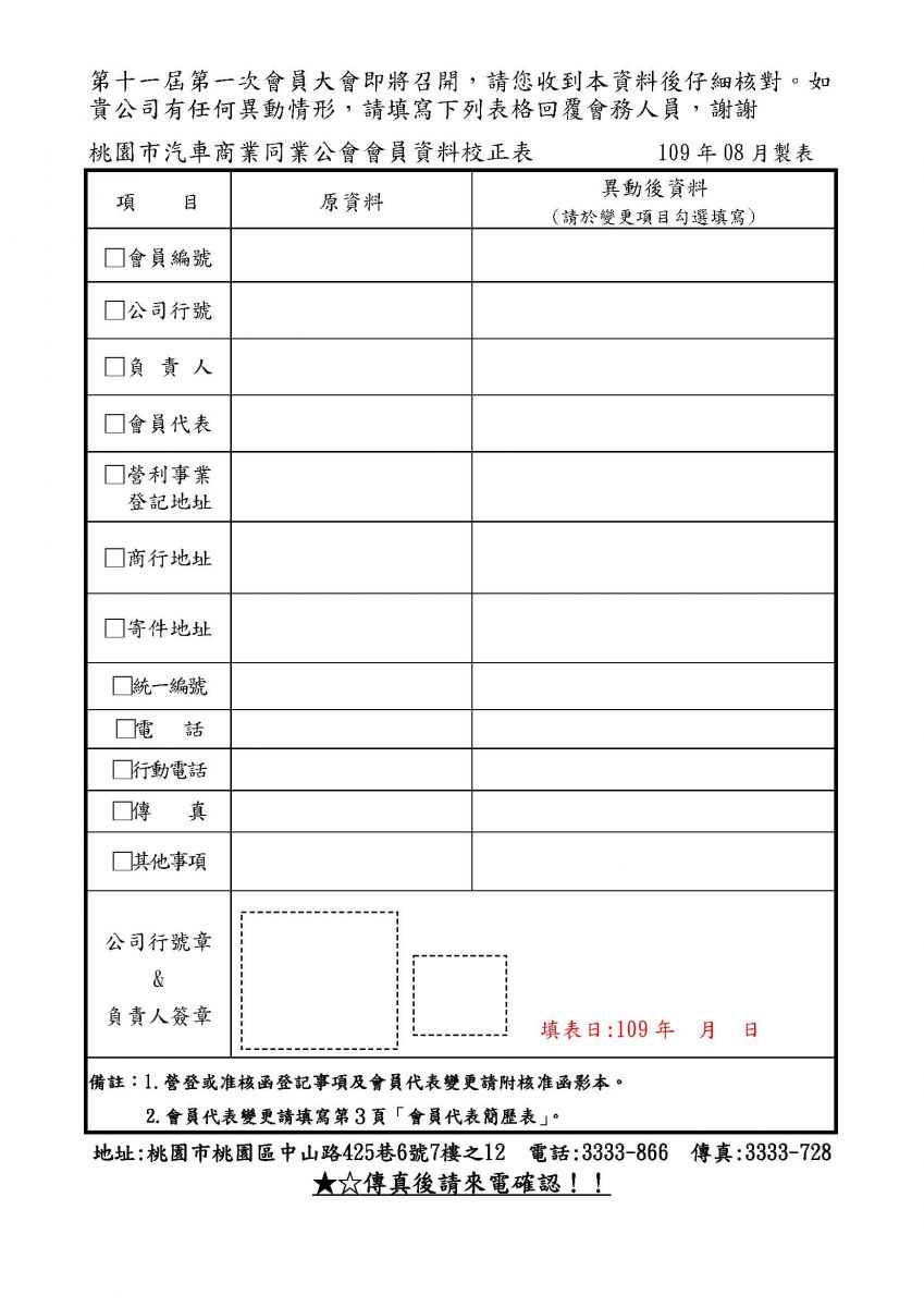 因換發110年度會員證書及印製第十一屆第一次會員大會大會手冊,進行會員會籍資料校正。檢附會籍校正資料表(如附件),請詳實核對。