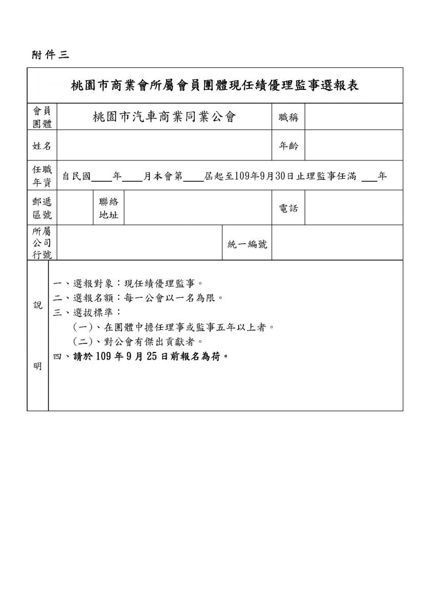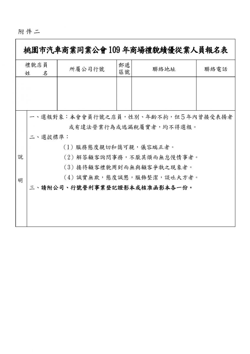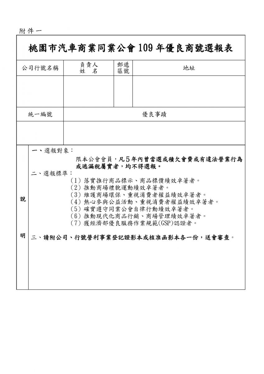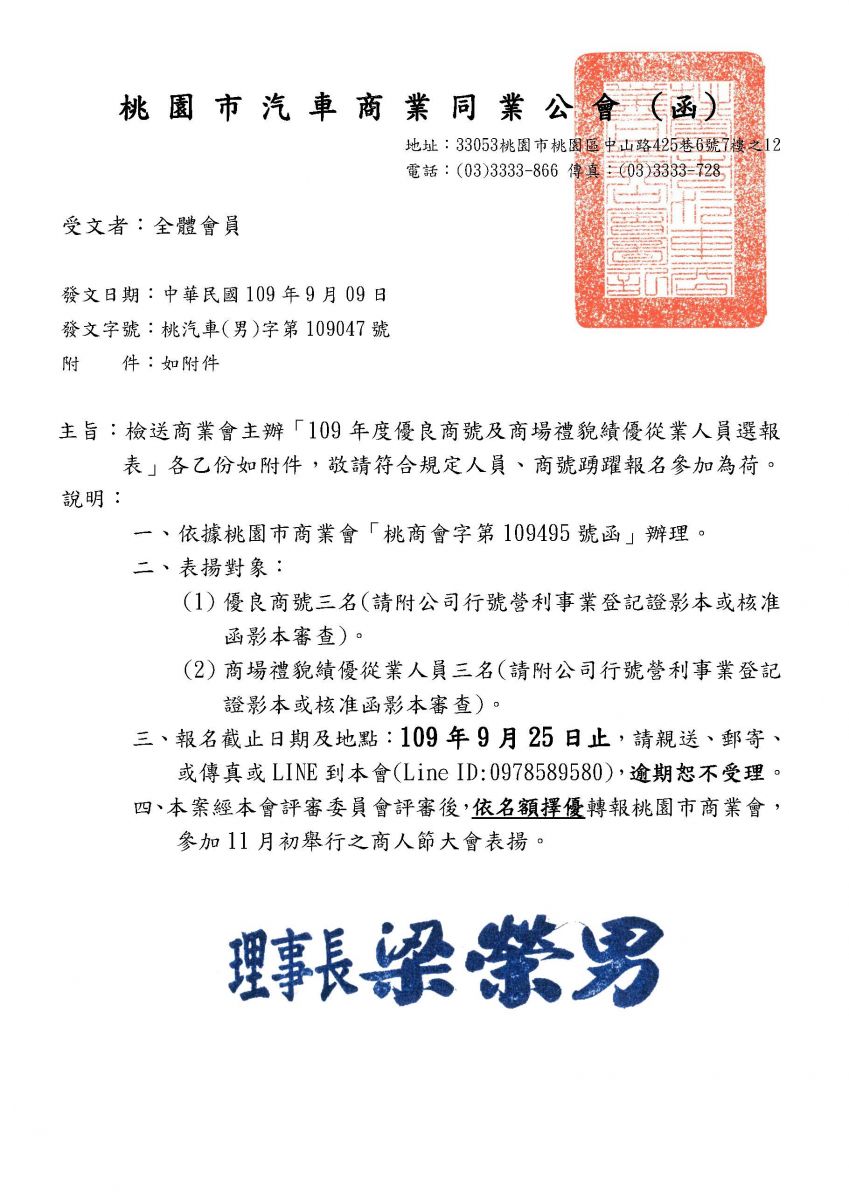 桃園市商業會主辦「109年度優良商號及商場禮貌績優從業人員選報表」各乙份如附件,敬請符合規定人員、商號踴躍報名參加為荷。